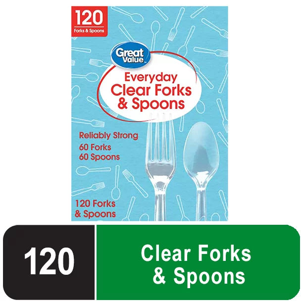 Great Value Everyday Disposable Plastic Forks & Spoons, Clear, 120 Count